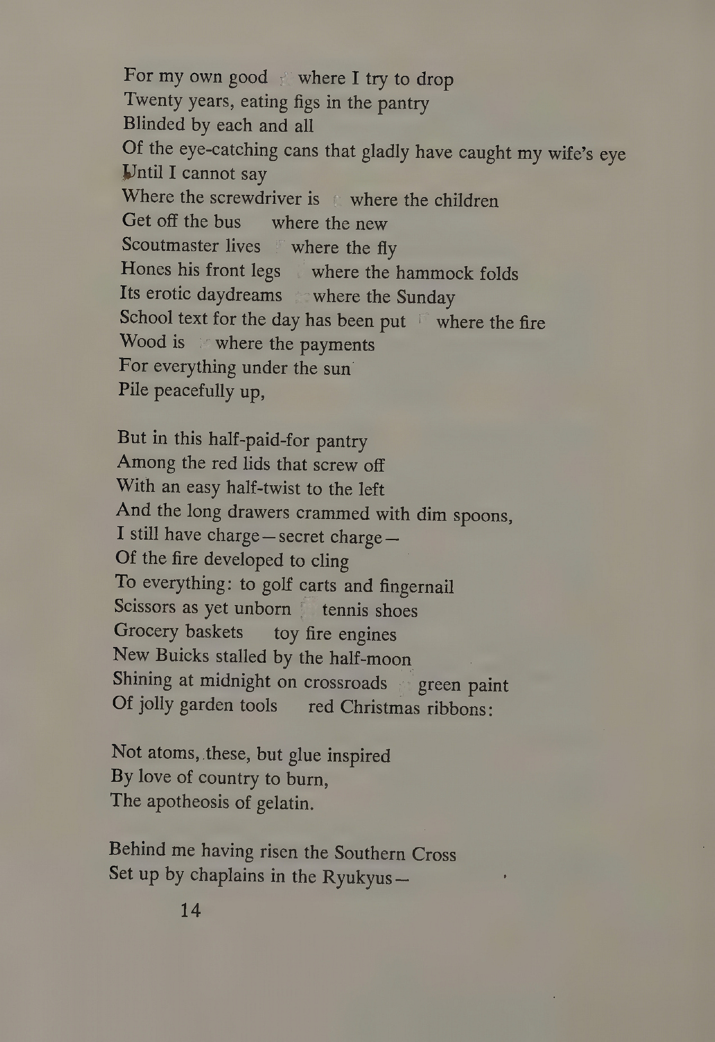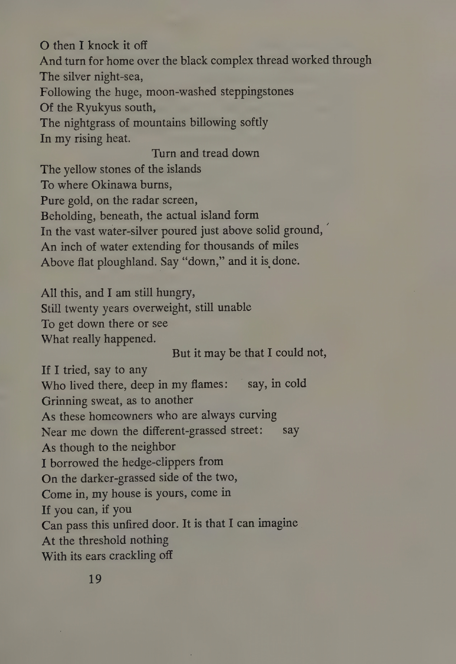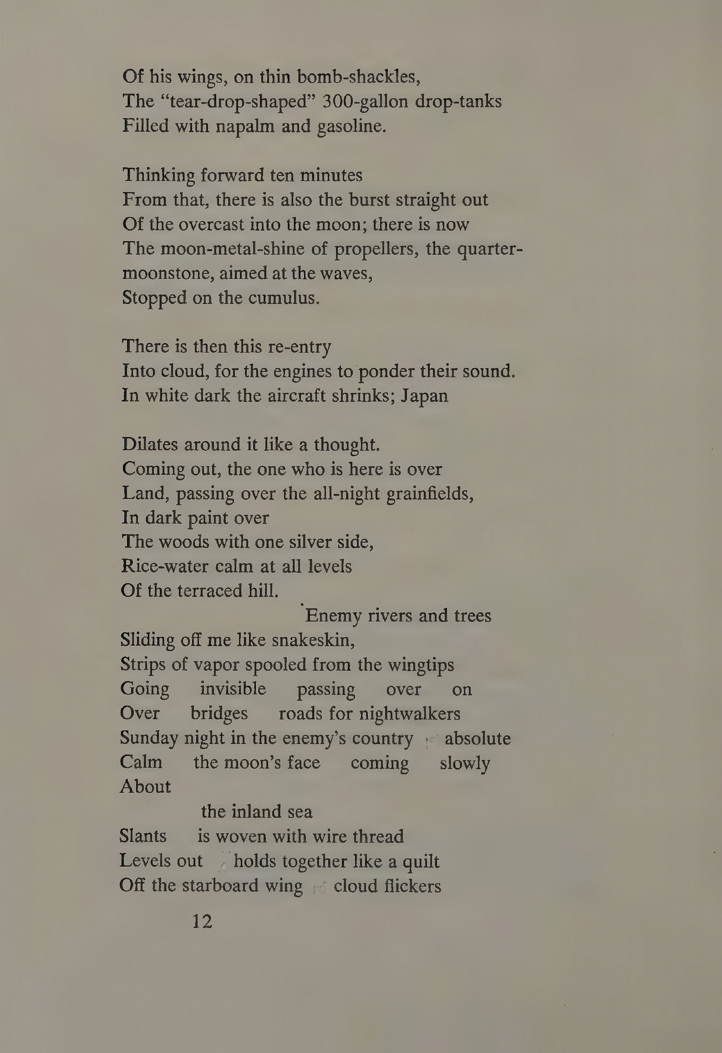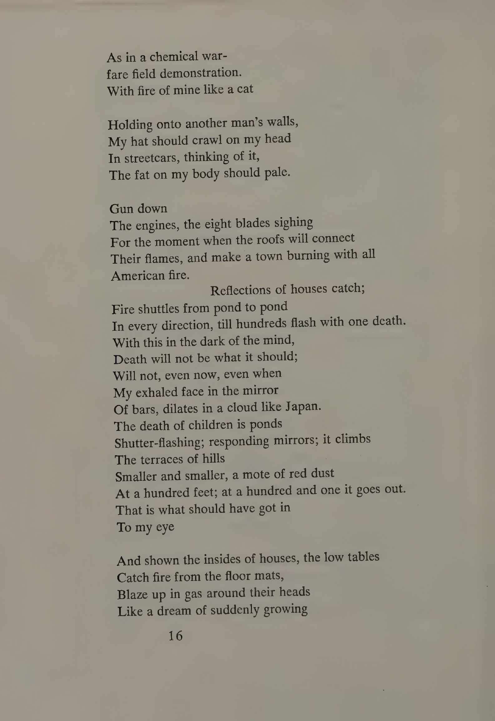 But “The Firebombing” can be shown to implicate the reader in the blame for the firebombing of Japan during World War 2. Bearing out the experiences of many war veterans, this reading is sound on several levels. First, politically, by sanctioning a government that, in war, sends people into battle, Americans sanction the bloodshed that ensues. Soldiers follow orders that are, “on behalf of the American people.” Second, psychologically, when the weight of guilt is too hard to bear, we pass it on to others to share it with us. Dickey, through the mirror of his craft, deftly reflects back into the picture those of us who deny complicity and disagree with the poem’s message.