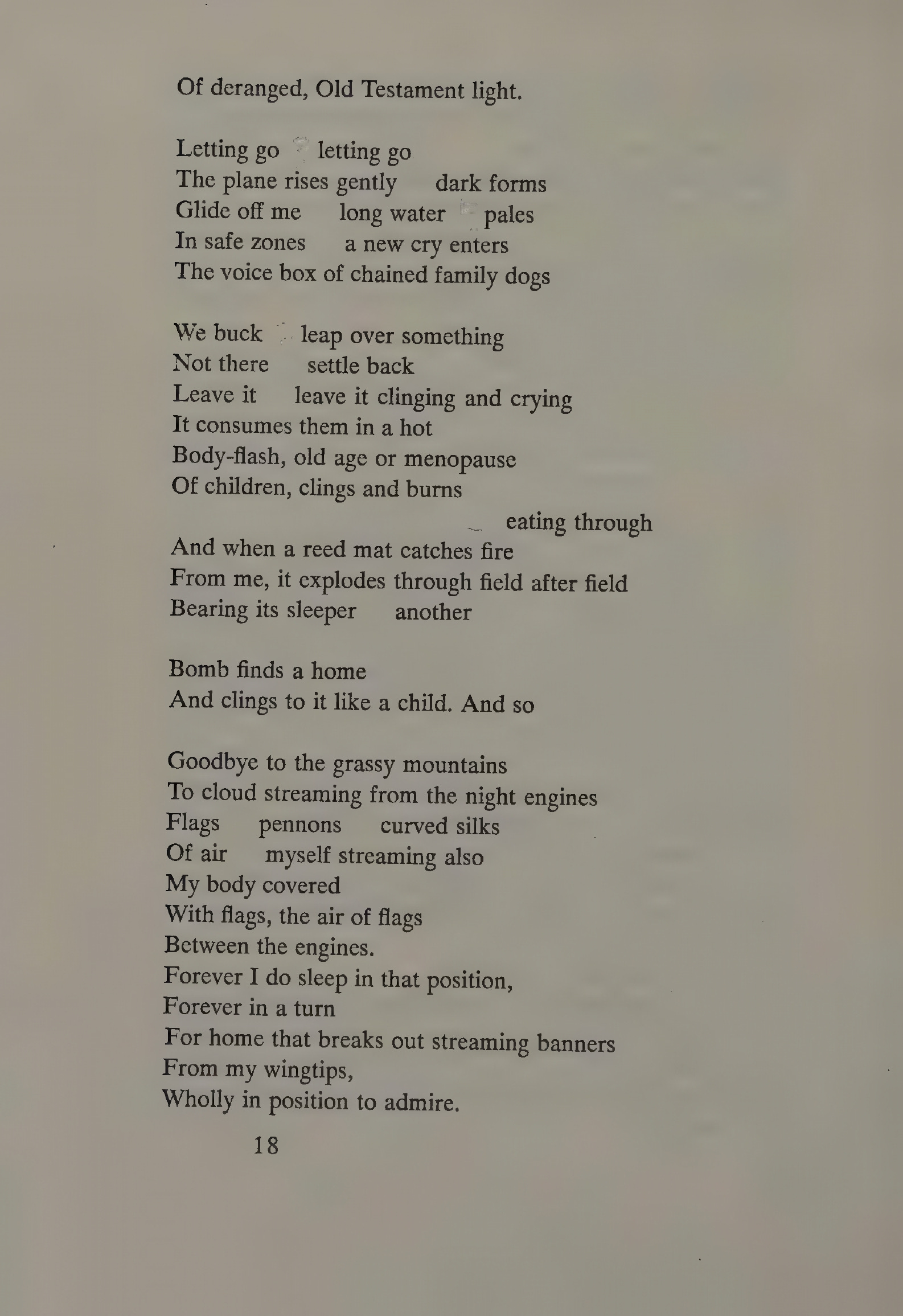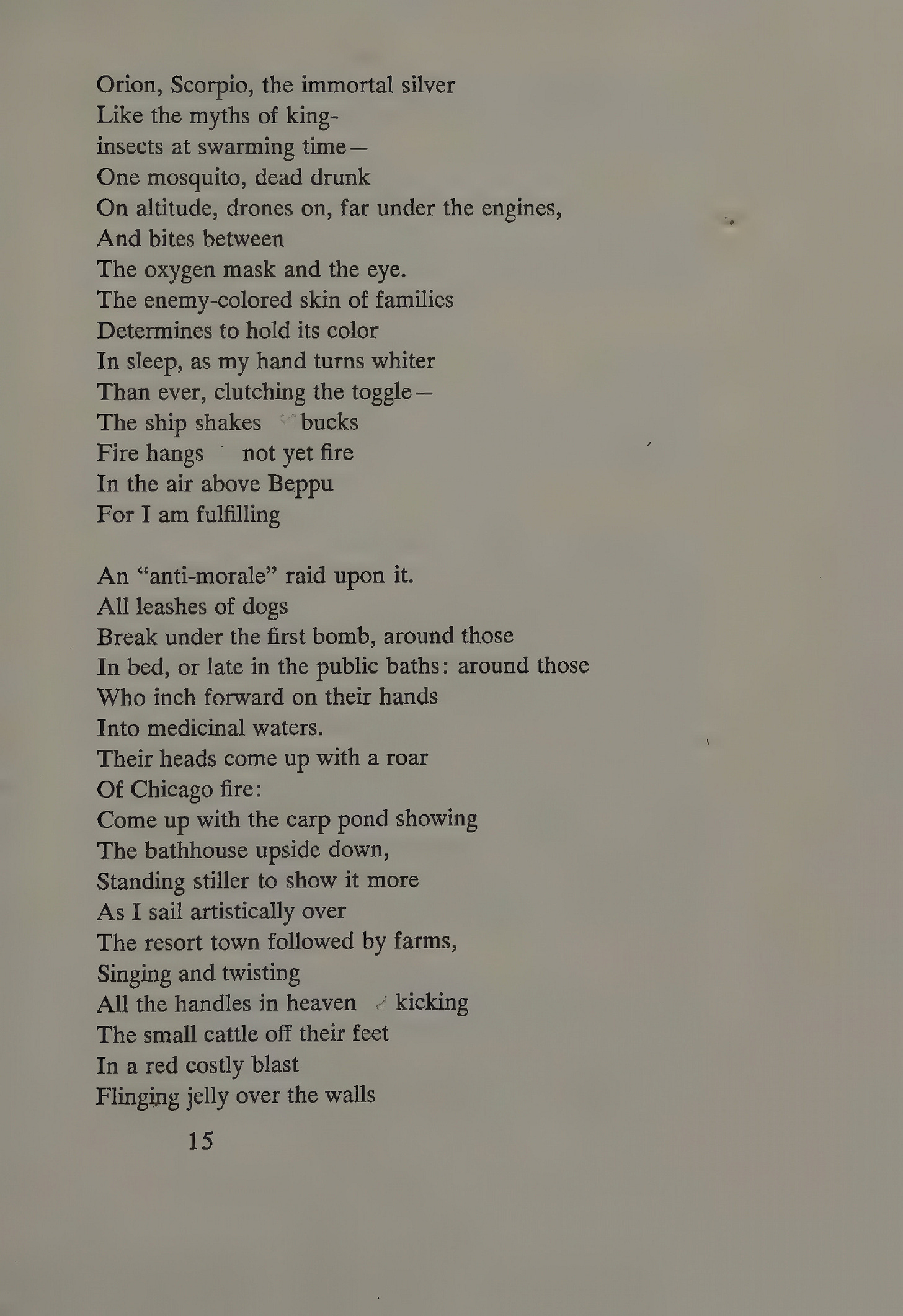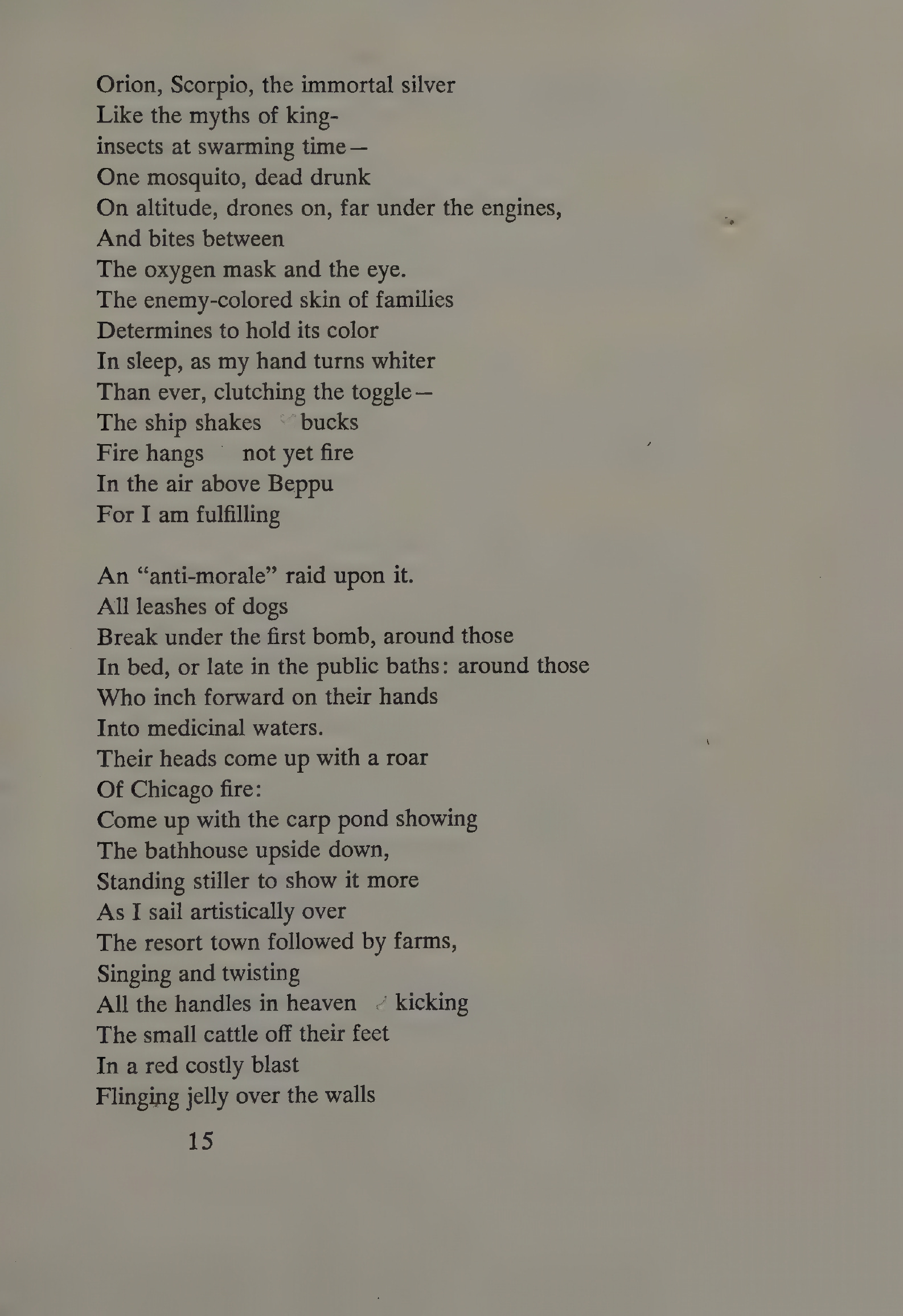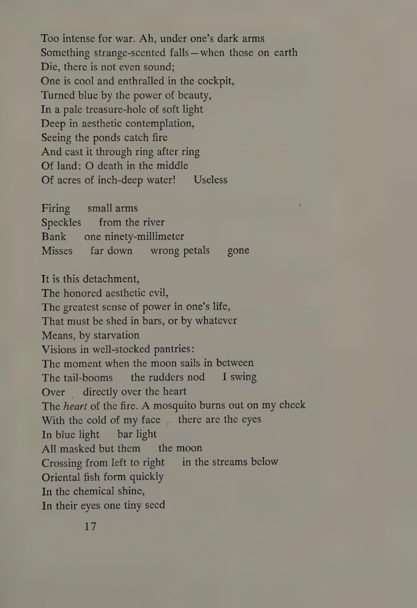 What David did with The Sabines, James Dickey does with his perhaps most controversial poem2 “The Firebombing.” This poem, written sympathetically from the point of view of an ex-bomber pilot in World War 2, has been described by Robert Bly as “gloating over power over others.” He calls Dickey a “Georgia Cracker Kipling” for writing what Bly characterizes as “new critical brainwashing that doesn’t wash.”