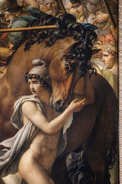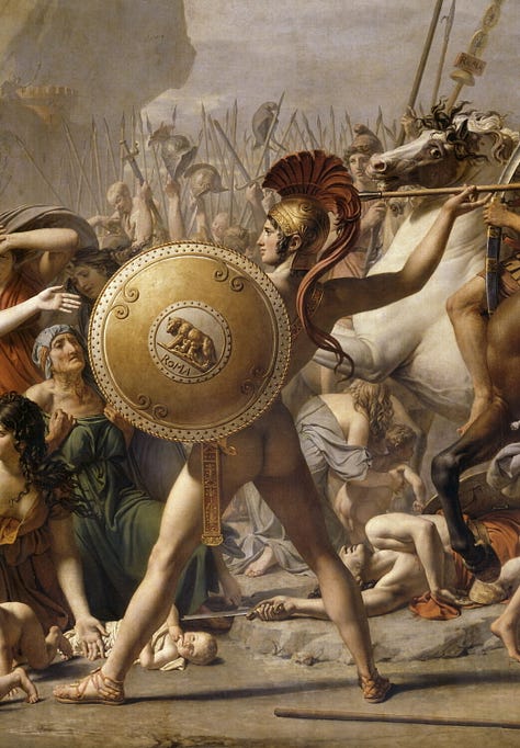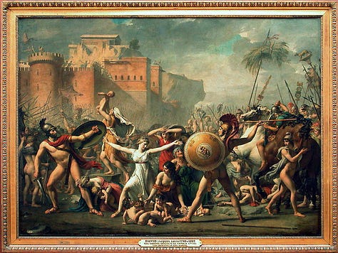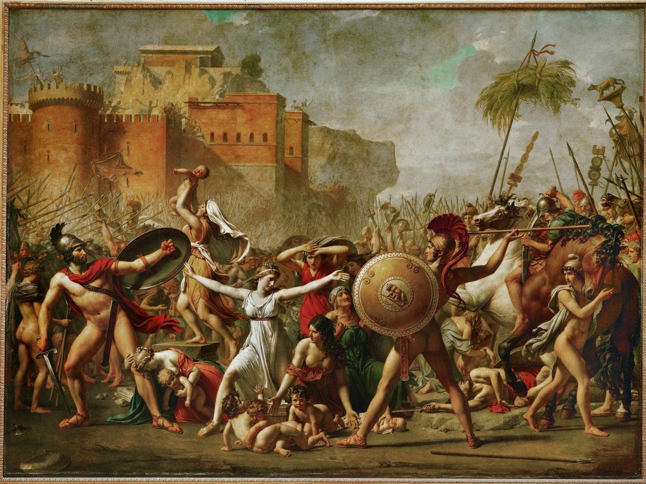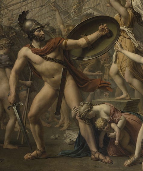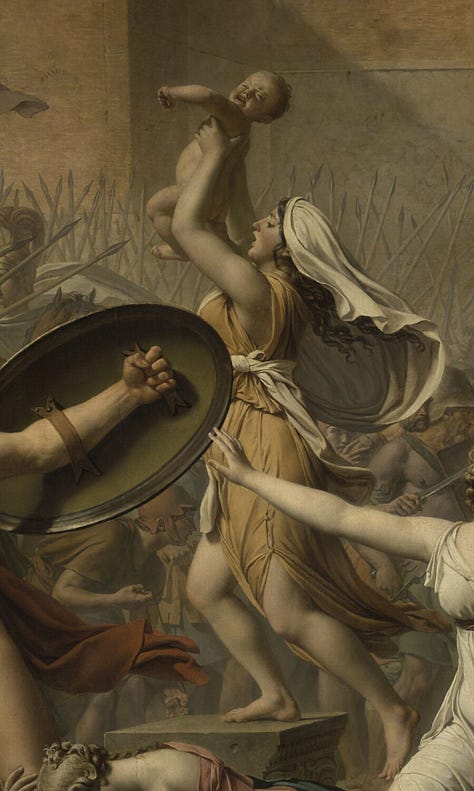 Jacques-Louis David originally displayed his painting The Sabines facing a cartouched oval mirror. When patrons turned their backs to the painting to look into the mirror, they saw themselves flattened two-dimensionally into the midst of the battle of the Sabines against the Romans-either imprinted over the central figure of the woman with arms outstretched as if on a crucifix, or standing under her arms, as if under protective wings. With a slight shift, the viewer became imprinted over the figure of the naked invading Roman who has his back to us, a round shield covering him. David’s unusual orchestration made a political statement at the time of the French Revolution: We are all involved and implicated in the struggle over freedom. The spectator may turn a back to it only to find herself or himself more fully reflected in it.